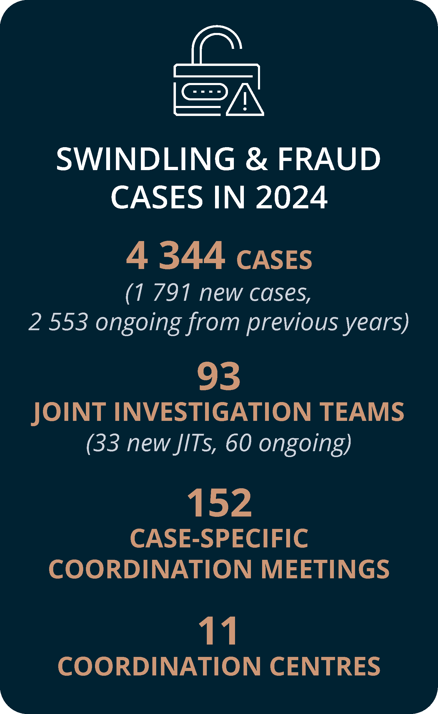 Swindling and fraud come in many shapes and forms, such as investment fraud, insurance fraud, benefit fraud, tax and excise fraud or consumer fraud. Since these crimes usually combine high profits and low risks, they are popular with organised crime groups (OCGs). The perpetrators often operate across borders, benefitting from differences in national legislations and adding complexity to the investigations required to uncover these criminal acts. Moreover, recent years have seen a rapid growth in fraud committed on the internet, with criminals taking advantage of huge numbers of unsuspecting users.