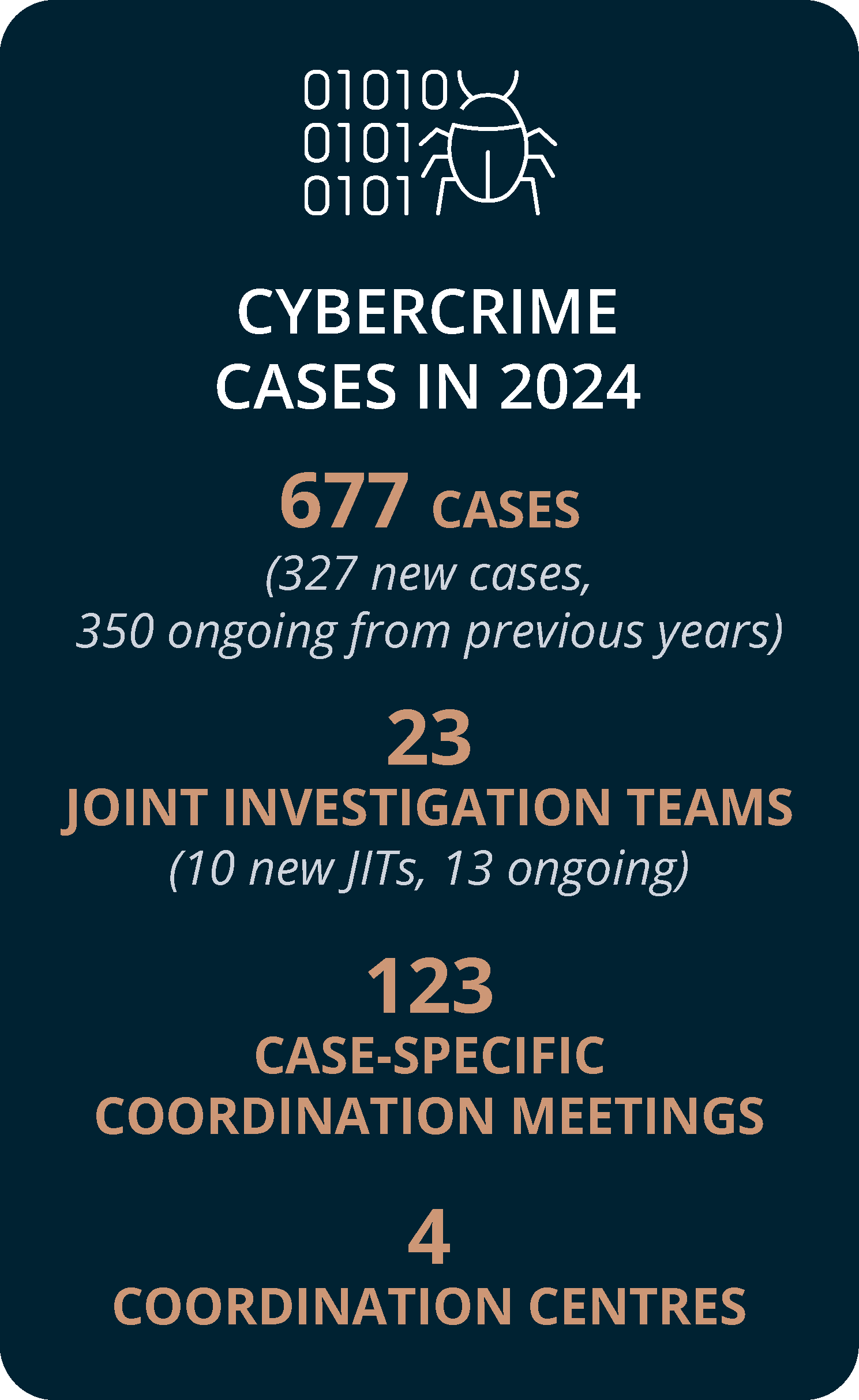 The often borderless nature of cyber- and cyber-related crime makes effective cross-border cooperation essential to investigate and prosecute perpetrators. Eurojust supports national authorities to work together and to make use of available cross-border investigative tools. Eurojust also hosts the European Judicial Cybercrime Network at the Agency’s premises in The Hague.