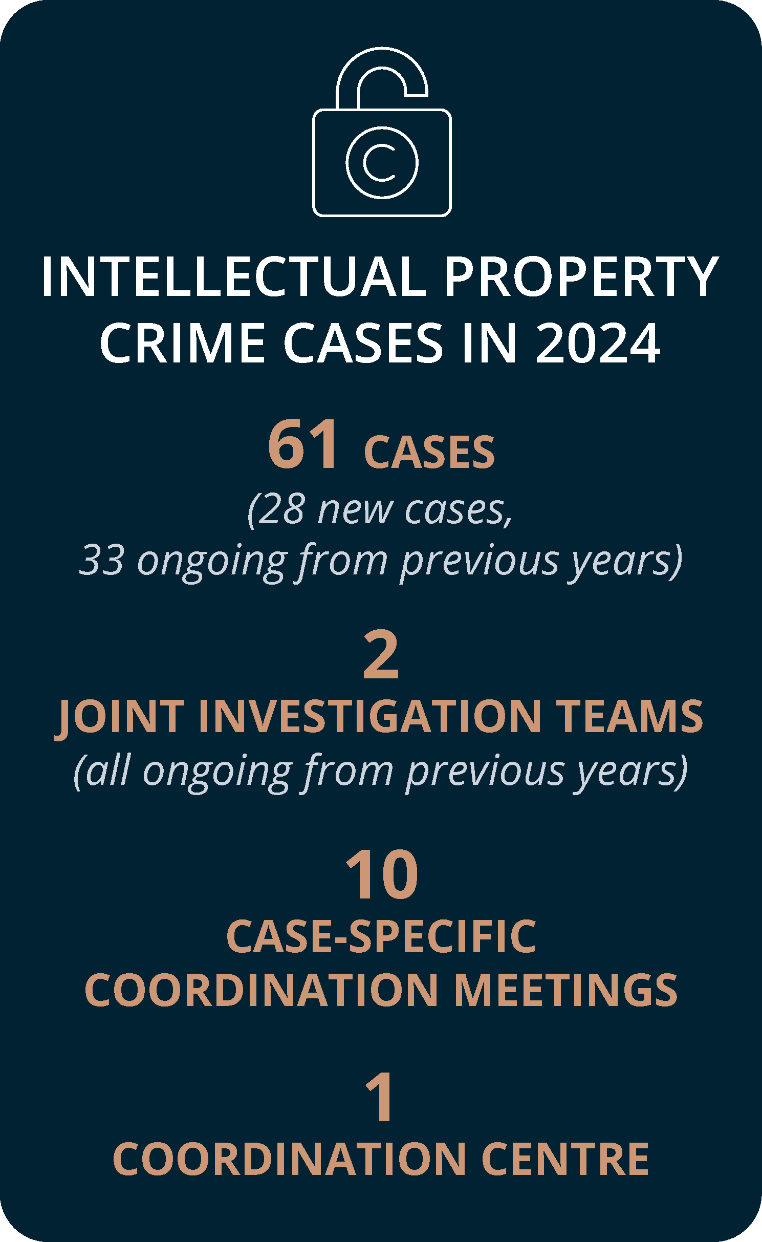 In 2021, Eurojust and the European Union Intellectual Property Office (EUIPO) established the Intellectual Property Crime Project (IPC Project), aimed at boosting cooperation and ensuring a more coherent and robust response against IP infringements across the EU.